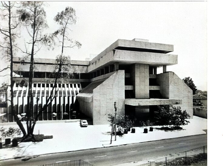 Australian architects Bernard Joyce and William Nankivell of Joyce Nankivell Associates were commissioned to design the building with Malaysian architecture firm Leong Thian Dan Rakan-rakan. They proposed a bold design in the Brutalist style. The ‘L’ shape plan with a lift and service tower at the junction of the wings successfully combined the dual obligations of high security and public access. |